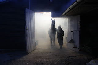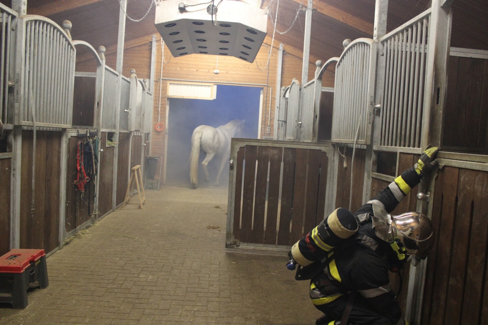 Nach der Erkundung an der Einsatzstelle, erteilt der Einsatzleiter den sofortigen Auftrag mit der Evakuierung der Pferde zu beginnen, da die Stallungen bereits teils verraucht sind und ein Übergreifen der Flammen bevorstehe.